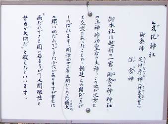 化気神社 鹿の角・彫刻 化気神社神宝に『いさざ王』と言う「丈1尺8寸4分の鹿角」がある。伊奢沙別命(いざさわけ)は応神天皇の本名である。表記の変化は「応神天皇を隠す」ためと考える。隠したい歴史とは、「応神天皇の吉備国内の軌跡」である。 平成22年4月30日に若狭哲六先生と片山伸栄氏に化氣神社を御案内いただいた。そして、神宝『いさざ王』の写真入手を草地知之宮司に依頼した。 毎年10月開催の加茂大祭に化気神社から神輿が出る。神輿の屋根は当日の朝、新しい「榊の葉」で葺かれる。『岡山県御津郡誌』には「柳の葉をもて毎年葉替をなすを例とす」とある。『古事記』では「豊玉毘売命が、海神国から地上の国にやってきて、海岸のなぎさにつくられた鵜の羽を葺草にした産室の屋根を葺き終わらないうちに出産した。八尋の鰐になって出産しているところを彦火火出見命に見られたために、豊玉毘売命は海神国へ帰った。」とある。「鵜の羽を葺草にした産室の屋根」の伝承、鵜の羽が柳の葉に変更されている。 4. 豊原北島神社の境内摂社 氣比神社 『岡山県神社誌』に収録されている氣比神社は、豊原北島神社(瀬戸内市邑久町北島)の境内摂社のみである。境内摂社に氣比神社がある。平成22年6月16日、野崎 豊先生に豊原北島神社を御案内いただいた。豊原北島神社は舒明天皇6年(634)豊前国宇佐より勧請、神社東の鎮座石の上に「藁をとき敷いて奉祀した」ことから、「ときわら」が荘名の「とよはら」となったと説明している。北島は往古、島であった。豊原荘北島に座す神社で延喜式外の古社、従五位上豊原北嶋明神である。祭神は応神天皇・神功皇后・比め大神・豊原北島神である。 境内摂社・氣比神社の説明に「祭神 足仲彦神(仲哀天王)・保食神。この地が北方とも交流があったことや、朝廷との結びつきがしのばれます。」とある。氣比神社の祭神名を保食神と品陀和気命(応神天皇)の父、足仲彦神(仲哀天皇)としている。